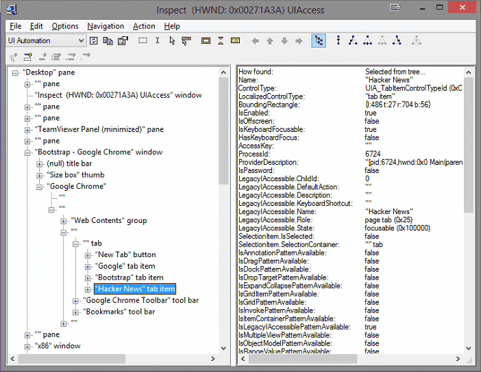To browse and treewalk through UI elements of an application, you can use the inspect tool by Mirosoft found in the Windows Developer Kit. As you can see from the screenshot below, the main caption of our parent “Google Chrome Window” is the active tab title.