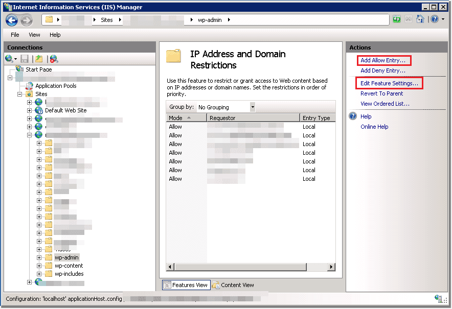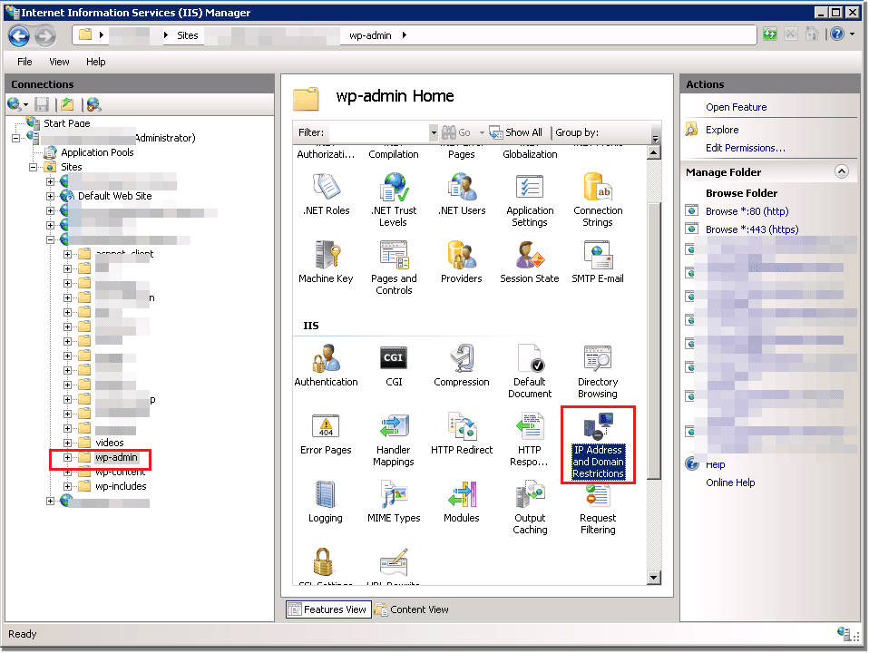 One way to secure WordPress running on Windows IIS is to restrict access to both the wp-admin directory and also the wp-login.php file by IP address. To do this on Linux it’s as easy as placing a .htaccess file in the directory you wish to secure. With IIS though it’s a little different, the guide below will run through how you can secure your WordPress via the IP Address and Domain Restrictions tool in IIS Manager.